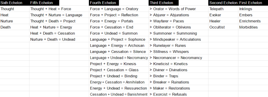 Once a character has learned three spells in a given echelon, they move onto the higher echelon and may start learning its spells. They may only increase their echelon along the line of their previously chosen element, i.e. a sixth echelon mage who has learned their first three Morbidities cannot become a Telepath.